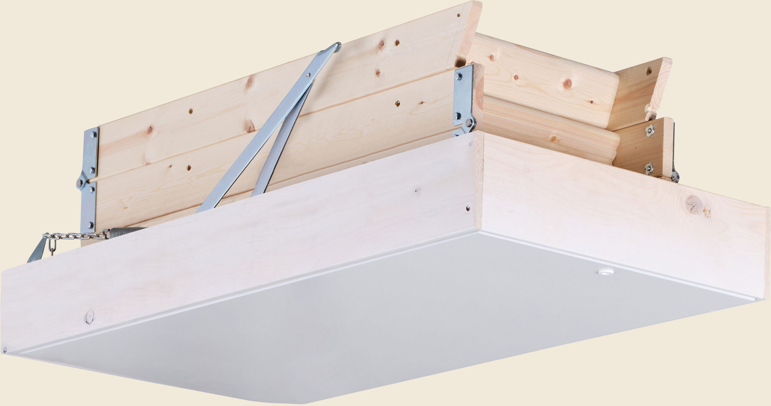 Luckan är underfalsad, och kan därmed kläs med innertaksmaterial < 22 mm. I hopfällt läge smälter den målade luckan in i önskad miljö. Luckan har 70 mm cellplastisolering och en vit board, men är i övrigt obehandlad.